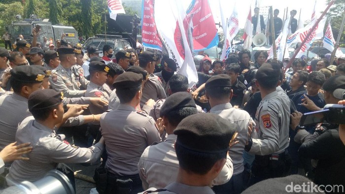 Aksi terus diwarnai kericuhan saat massa berusaha memblokade jalan. Namun kericuhan ini tak berlangsung lama setelah kedua pihak bisa menahan diri.