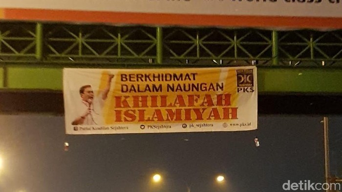 Spanduk itu dipasang di flyover Jalan Tol Lingkar Timur Jatiasih, Jalan Raya Jatimekar, Kota Bekasi. Dalam spanduk itu tertulis 'Berkhidmat Dalam Naungan Khilafah Islamiyah' dengan logo PKS dan sosok pria di sisi kanan dan kiri.