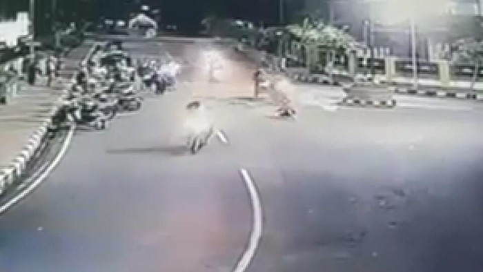 Tak berselang lama, saat melintasi polisi tidur (speed bump), pelepah palem robek. Akibatnya, remaja yang menaiki pelepah daun palem terpental dan nyaris tertabrak sepeda motor lain yang membawa gerobak. Sementara itu, sejumlah rekannya yang tengah nongkrong di dekatnya justru bersorak-sorai.