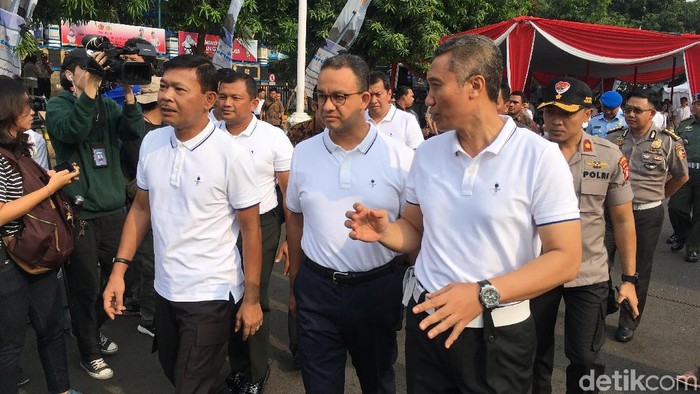 Anies tiba pukul 07.55 WIB. Anies tiba mengenakan polo shirt berwarna putih bertuliskan 'Berteman Jakarta' di bagian belakang. Setibanya di lokasi Anies langsung menuju tenda tamu undangan.