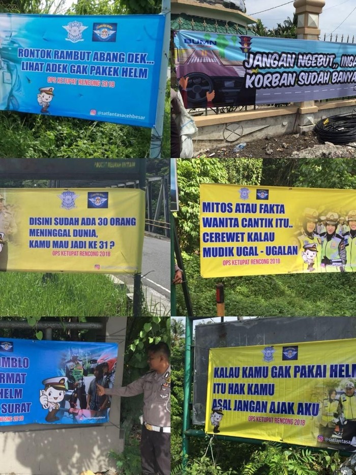 Spanduk-spanduk lucu yang didesain menggunakan gambar dan tulisan ini dipasang di wilayah timur dan barat Aceh Besar, Aceh. Untuk mudik tahun ini, Satuan Lalu Lintas (Satlantas) Polres Aceh Besar membuat sekitar 50 spanduk. Lokasi pemasangannya pun di tempat-tempat rawan kecelakaan.