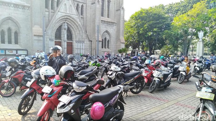 Terlihat ratusan sepeda motor jemaah salat Idul Fitri Masjid Istiqlal terparkir dengan rapi di halaman gereja ini, Jumat (15/6/2018).