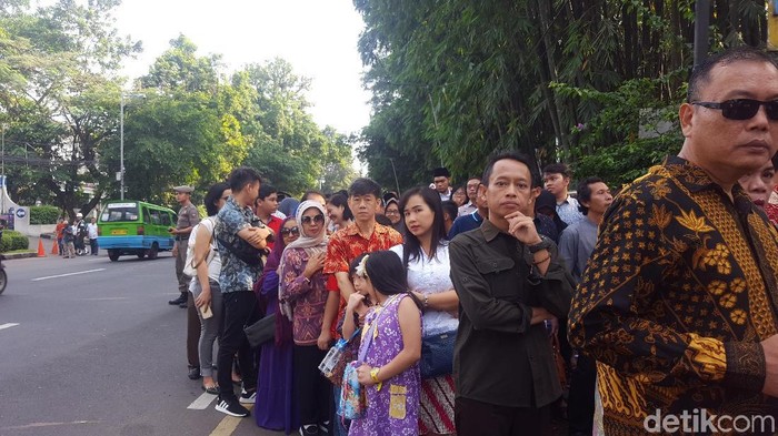 Pantauan detikcom, Jumat (15/6/2018), pukul 09.00 WIB, di depan pintu 2 Kebun Raya Bogor, Jawa Barat, antrean sepanjang kurang-lebih 100 meter ini mengular demi keinginan bertemu dengan Presiden Jokowi. Open house tersebut digelar pukul 09.30 WIB.
