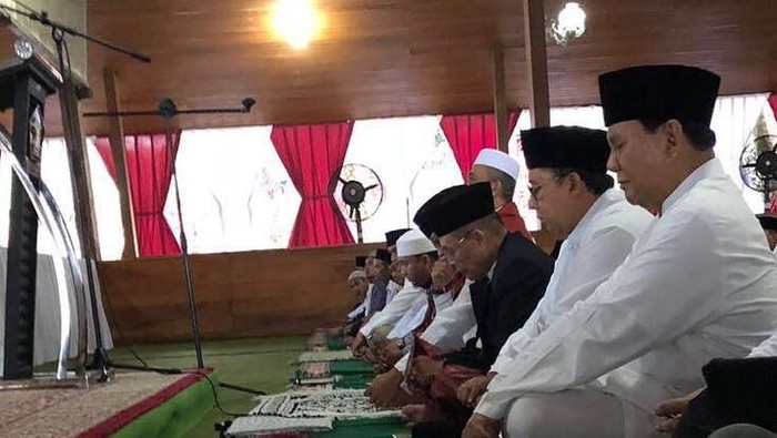 Prabowo melaksanakan salat id di Padepokan Garuda Yaksa, Hambalang, bersama warga dan pengurus Gerindra. Salah satunya Waketum Gerindra Fadli Zon.