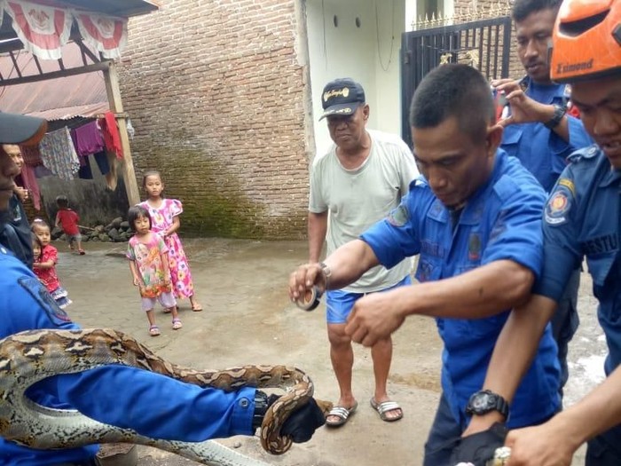 Diduga, sanca 4 meter ini keluar dari habitat karena sebelumnya terusik oleh hujan deras seharian yang melanda Kota Makassar.