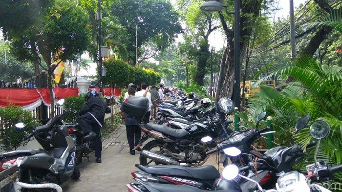 Pantauan detikcom, puluhan motor berjejer parkir di trotoar depan gedung DPRD DKI, Jalan Kebon Sirih, Jakarta Pusat, sekitar pukul 09.40 WIB. Tampak para petugas dari gedung DPRD sedang menjaga motor-motor tersebut.