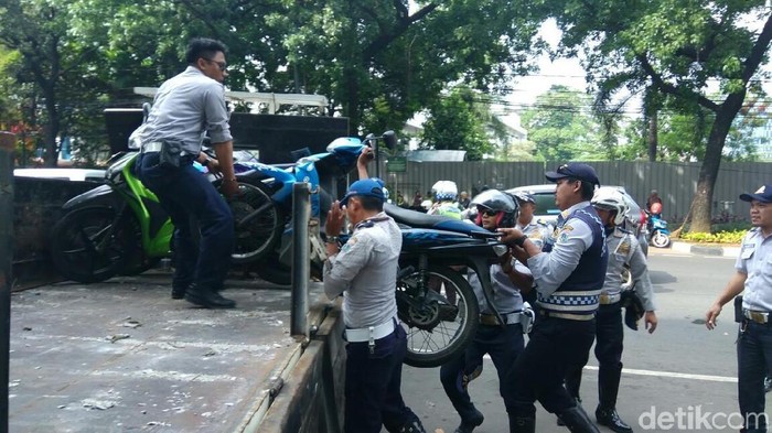 Pantauan detikcom, puluhan motor tersebut diangkut dari trotoar di depan Gedung DPRD DKI, Jl Kebon Sirih, Jakarta Pusat, Jumat (22/6/2018), sekitar pukul 10.00 WIB. Motor diangkut ke truk-truk milik Dishub DKI.
