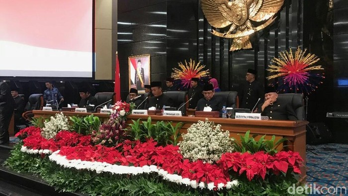 Sidang paripurna ini digelar di gedung DPRD DKI, Jl Kebon Sirih, Jakarta Pusat, Jumat (22/6/2018) pukul 15.00 WIB. Anies dan Sandiaga kompak mengenakan beskap berwarna hitam.