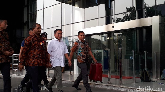 Pantauan detikcom di gedung KPK, Jalan Kuningan Persada, Jakarta, Rabu (4/7/2018). Irwandi mengenakan pakaian kemeja putih. Irwandi yang dikawal pegawai KPK menuju lobi gedung.