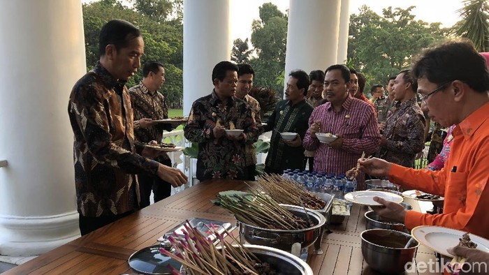Jokowi membuka terlebih dahulu dengan mengambil beberapa tusuk sate yang dibumbui dengan kecap serta acar timun, wortel, dan bawang. Para bupati kemudian menyusul mengambil beberapa tusuk sate.