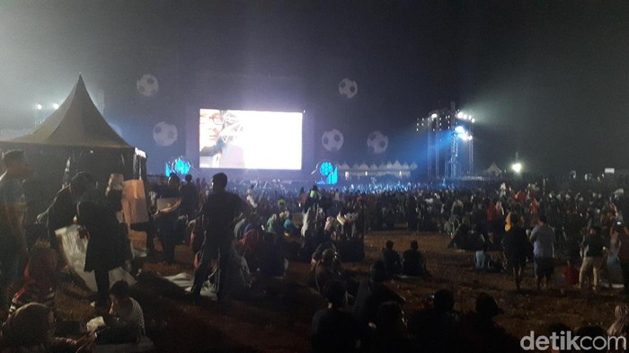 Berbagai usia penonton berada di depan layar lebar di lapangan. Tak lupa, mereka menyempatkan diri untuk foto di patung pemain timnas yang disediakan seperti Marcus Rashford, Eden Hazard dan lainnya.