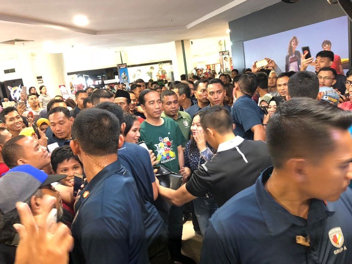 Tak berlama di hotel, Jokowi langsung ke Mal Panakkukang, Jl Boulevard, Kota Makassar, Sulawesi Selatan sekitar pukul 20.00 WITA. Begitu keluar dari mobil, Jokowi yang tampak mengenakan baju kaus bertema Asian Games 2018 langsung membuat warga heboh.