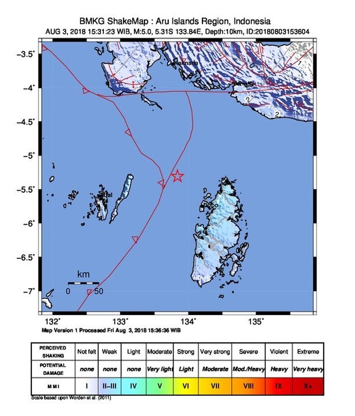 Gempa terjadi pada hari ini pukul 15.31 WIB. Lokasi gempa ada di koordinaat 5,31 lintang selatan (LS) dan 133,84 bujur timur (BT).