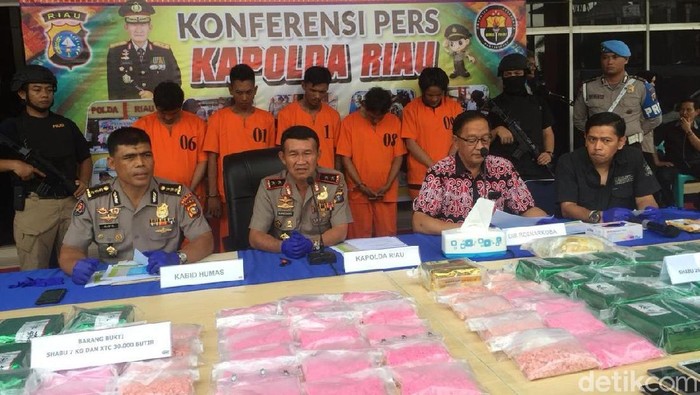 "Dalam kasus ini kita mengamankan lima orang tersangka sindikat internasional. Seluruh barang bukti sabu dan ekstasi senilai Rp 42,75 miliar," kata Kapolda Riau Irjen Nandang dalam jumpa pers, Jl Sudirman, Pekanbaru, Jumat (3/8/2018).