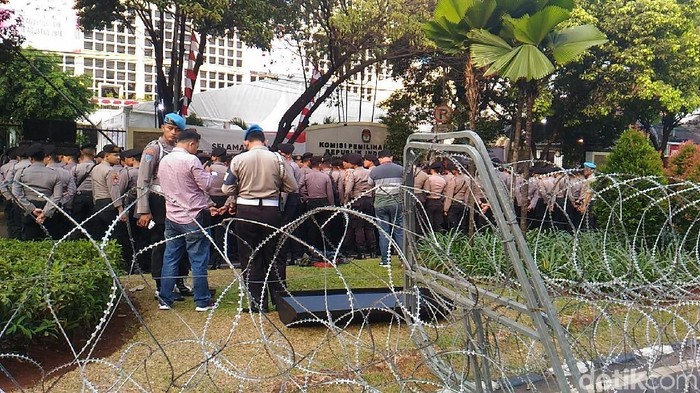 Sementara itu, jalan di depan KPU ditutup dan dijaga ketat oleh polisi. Kawat berduri juga sudah dipasang di depan gedung KPU.
