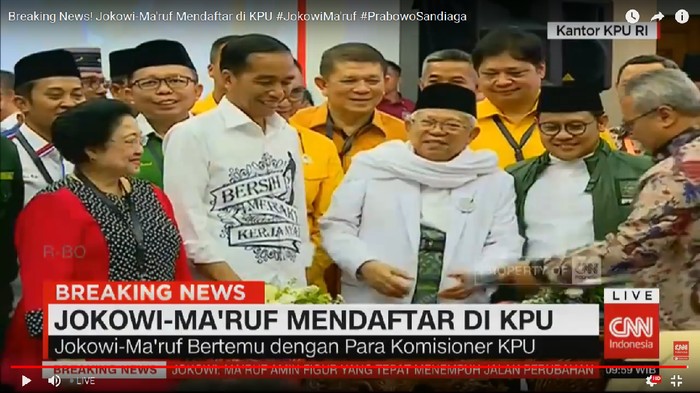 Setelah menyerahkan syarat, Jokowi dan Ma'ruf Amin duduk di depan para komisioner KPU yang memeriksa syarat. Ketum-ketum parpol duduk di samping keduanya.