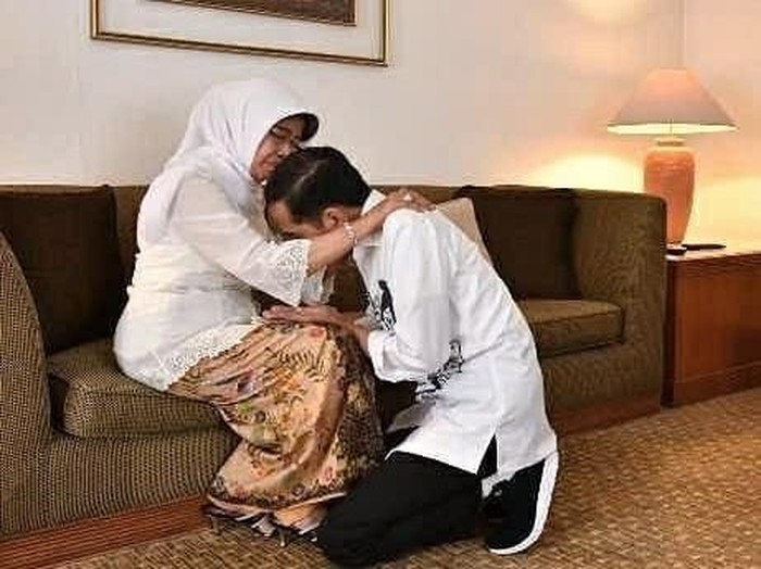 Sebelumnya diberitakan, momen sungkeman itu dunggah Jokowi di akun Instagramya. Jokowi terlihat bersimpuh di hadapan Sudjiatmi dan sungkem. Tampak Jokowi mengenakan kemeja putih bertuliskan 'Bersih, Merakyat, Kerja Nyata' dan sepatu sneakers hitam.
