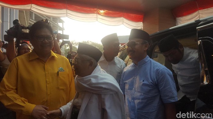 Pantauan detikcom, Ma'ruf datang di DPP Golkar, Jl. Anggrek Neli, Slipi, Jakarta Barat, sekitar pukul 16.33 WIB, Jumat (10/8/2018). Ma'ruf disambut Ketum Golkar Airlangga dan Sekjen Golkar Lodewijk Freidrich Paulus.