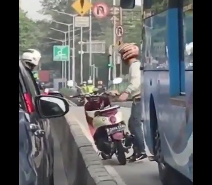 Dilihat detikcom, Sabtu (11/8/2018), dalam video berdurasi sekitar 2 menit itu, tampak seorang pemotor pria membantu 2 pemotor lain mengangkat motor mereka melewati separator busway. Tiba giliran motornya diangkat, pengendara lain keburu 'kabur' dan tak membantu.