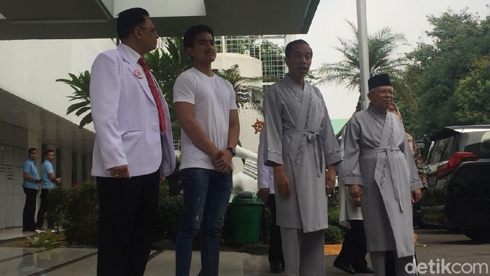 Jokowi keluar bersama Ma'ruf dari gedung Medical Check Up RSPAD Gatot Subroto, Minggu (12/8/2018) sekitar pukul 09.29 WIB. Keduanya memakai baju pasien berwarna abu-abu. Sementara Ma'ruf tetap memakai peci hitamnya.