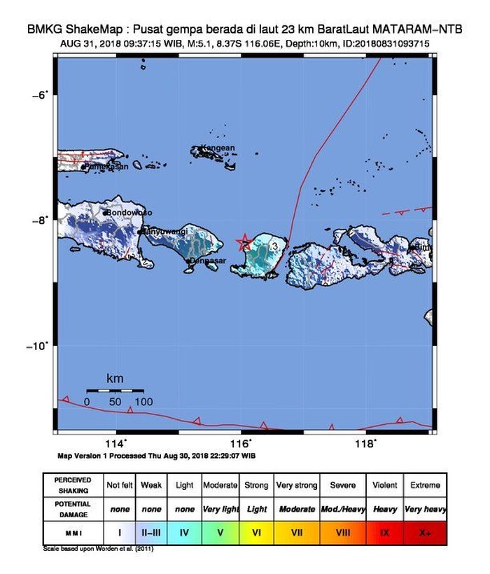 Badan Meteorologi, Klimatologi, dan Geofisika (BMKG) mengabarkan gempa terjadi pada hari ini, Jumat (31/8/2018) pukul 09.37 WIB. Lokasi gempa ada di koordinat 8,37 lintang selatan (LS) dan 116,06 bujur timur (BT).