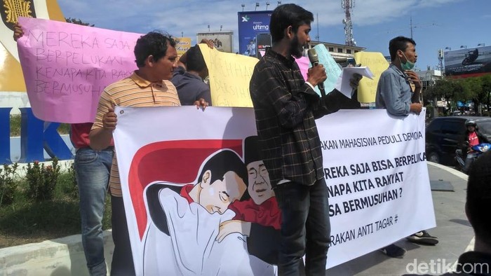 Dalam aksinya, massa memuji kekompakan Jokowi dan Prabowo saat menonton salah satu pertandingan di Asian Games beberapa waktu lalu. Foto pelukan dua calon presiden itu dinilai dapat membuat suasana menjadi adem.