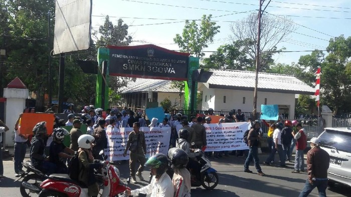 Ratusan pelajar SMK Negeri 3 Gowa menggelar unjuk rasa pada pukul 08.30 Wita Senin (10/9/2018) di depan gerbang sekolah, Jalan Mesjid Raya Sungguminasa, Kabupaten Gowa, Sulawesi Selatan.