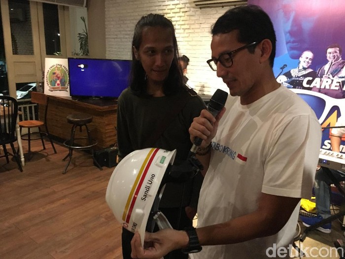 "Ini helm baru dipakai 2 kali, yang penting teman-teman Lombok bisa merasakan sedekah dari Mas Dodo," kata Sandiaga.