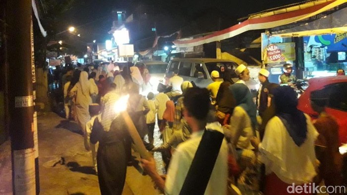 Pantauan detikcom, Senin (10/9/2018) pukul 19.48 WIB, ratusan warga Kampung Jemblongan, Sawangan, Kota Depoh, sudah bersiap-siap di lapangan Pasegal. Warga yang berusia dewasa hingga anak-anak membawa obor untuk pawai.