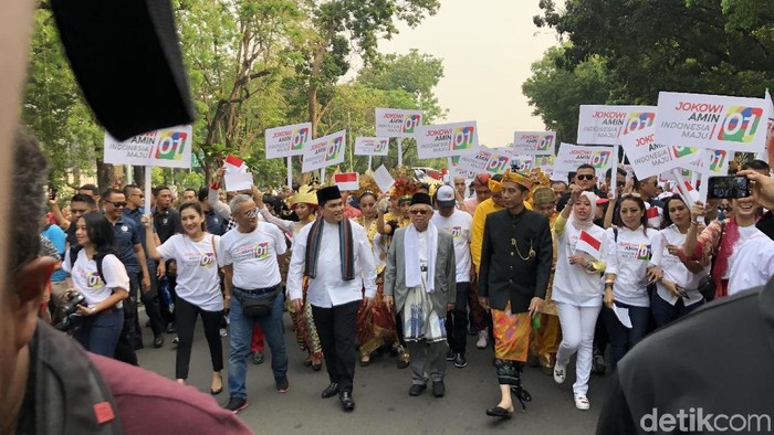 Pasangan itu berjalan kaki melintasi Jl Medan Merdeka Barat bersama dengan para pengurus Tim Kampanye Nasional (TKN) dan para pendukunga serta relawan di karnaval, Minggu (23/9/2018) pagi tadi.