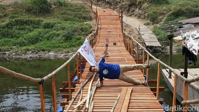Sandiaga bergaya plank dan side plank di jembatan. Aksi itu dia peragakan di depan warga Desa Bojong Kulur dan mendapat simpati warga yang bertepuk tangan sambil meneriakkan 'Prabowo-Sandi'.