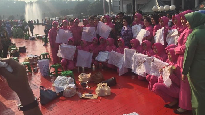Sementara itu, di Plaza Mabes TNI terlihat ribuan ibu-ibu telah duduk rapi. Mereka tampak membawa kain dan canting. Ibu-ibu itu tampak luwes membatik dengan canting. (ibh/aan)