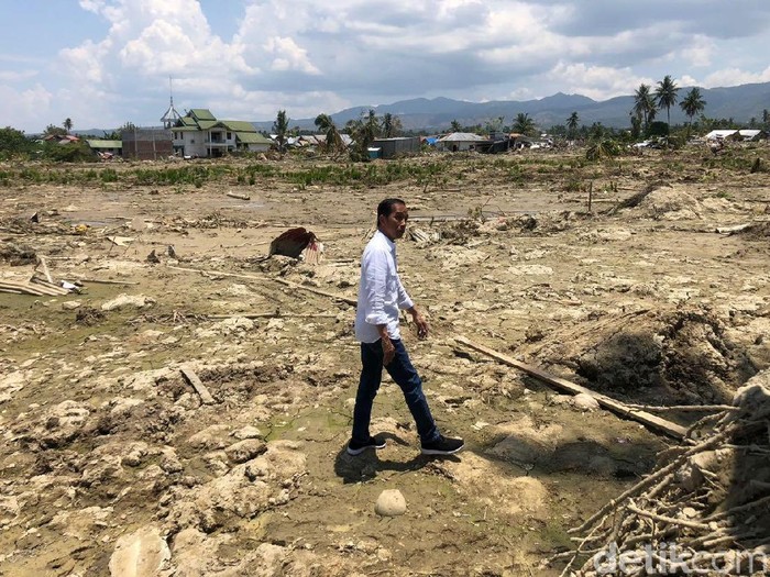 Pandangan Jokowi menyapu luasnya permukiman yang luluh lantak itu. Pantauan detikcom, bangunan yang rata dengan tanah itu tertimbun lumpur yang mulai mengeras.