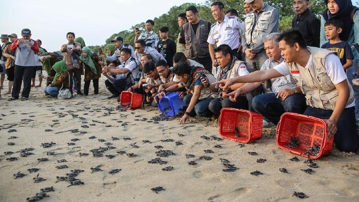 Pada Sabtu (7/9) di area konservasi penyu di Pantai Ujung Genteng, Tim Ekspedisi APPSI bersama Pemprov Jabar melepas 570 tukik yang telah ditetaskan pada malam harinya.