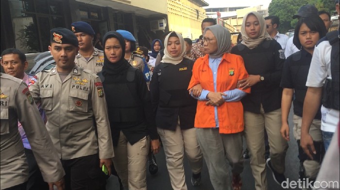 Ratna berjalan kaki menuju ruang tahanan dengan dikawal ketat personel polisi. Jarak antara Biddokes Polda Metro menuju ruang tanahan sekitar 100 meter.