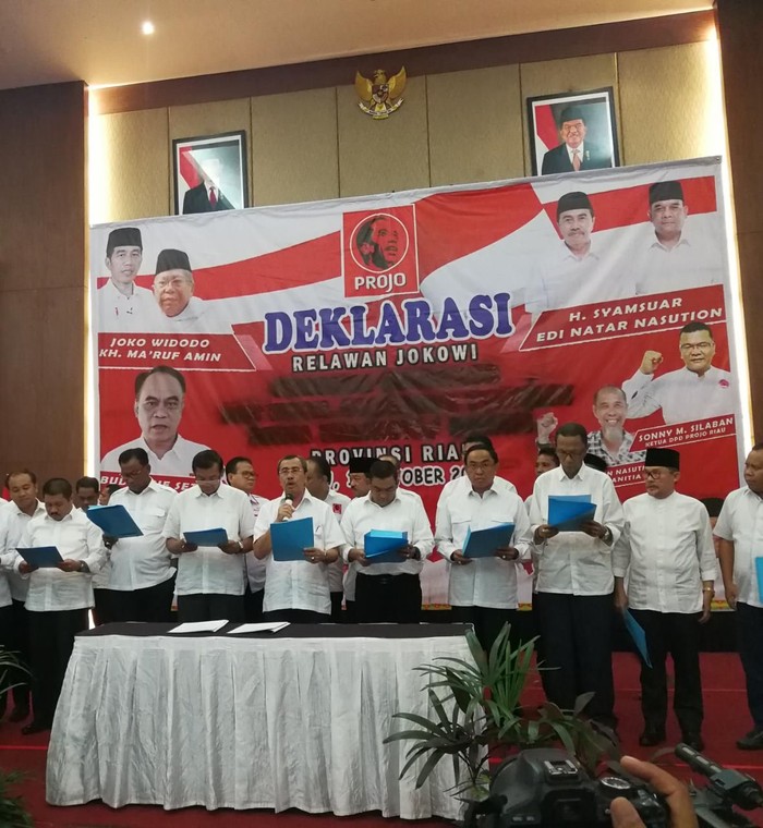 Deklarasi ini dihadiri Gubernur Riau terpilih Syamsuar dan Wagub terpilih Edy Natar Nasution. Deklarasi digelar pada Rabu (10/10/2018) di salah satu hotel berbintang empat di Pekanbaru. Ormas Projo, beserta ketua umumnya Budi Arie Setiadi, turut menyaksikan deklarasi tersebut.