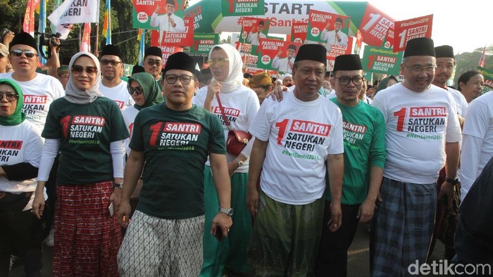 "Hari santri ini, keberhasilan kita adalah 3 yang pertama alhamdulillah capres PKB pak Jokowi, cawapresnya bukan hanya santri tapi kiyai malah jauh di atas santri. Istilahnya begini, targetnya yang jadi Wapres itu santri yang jadi kiyai apa lagi, atau kebalik harusnya yang jadi Wapres santri tapi kebablasan jadi kiyai. Nggak tahu lah yang mana ini agak sensitif ini. Menyangkut ada yang patah hati," kata Cak Imin diikuti tawa peserta yang hadir, di DPP PKB, Jl Raden Saleh, Jakarta Pusat, Minggu (14/10/2018).