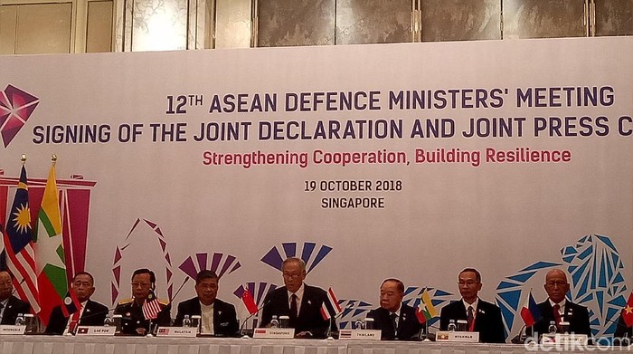 Pertemuan ADMM digelar di Hotel Shangri-La, Singapura, Jumat (19/10/2018). Mewakili menhan se-ASEAN, Menhan Singapura Ng Eng Hen menyampaikan belasungkawa kepada Menhan Indonesia Ryamizard Ryacudu.