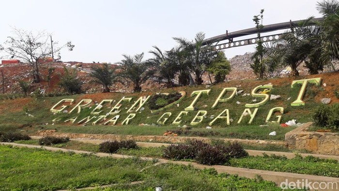 Sayang, tulisan ikonik 'Green TPST Bantargebang' tampak kotor bercampur sampah plastik. Terlihat seorang petugas kebersihan memungut sampah di sekitar area tersebut.
