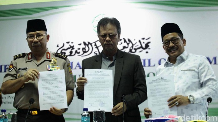 Pernyataan ini disampaikan Sekjen MUI Anwar Abbas dalam jumpa pers di kantor MUI, Jl Proklamasi, Jakarta Pusat, Selasa (23/10/2018). Ikut hadir dalam jumpa pers Waketum MUI Yunahar Ilyas serta Kadiv Humas Polri Irjen Setyo Wasisto.