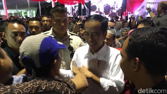 Jokowi yang tampak mengenakan kemeja putih lengan panjang itu tampak meladeni beberapa permintaan salam dan foto warga. Setelah beberapa menit, Jokowi duduk berdampingan dengan Menteri Agraria dan Tata Ruang Sofyan Jalil dan Gubernur Anies di panggung yang disediakan.