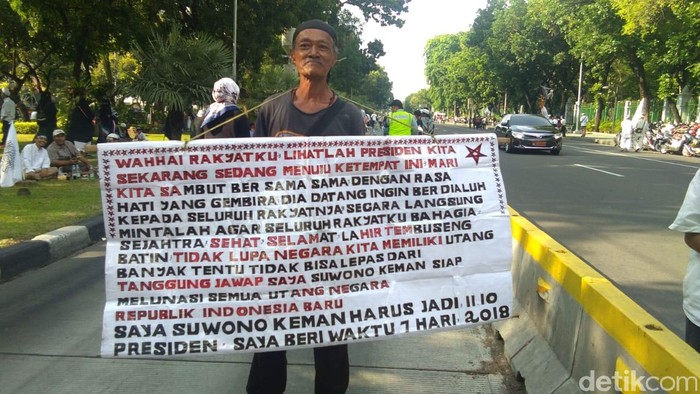 "Saya Suwono Keman harus jadi 11 10 Presiden. Saya beri waktu 7 hari 2018," demikian bunyi tulisan di spanduk yang dibawanya beraksi di Jl Medan Merdeka Barat, Jumat (26/10/2018).