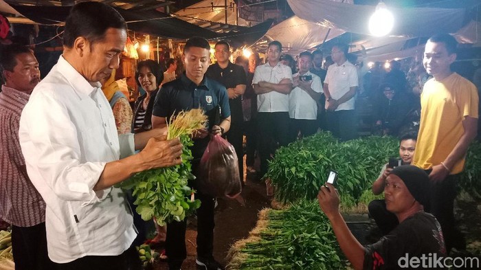 Hampir sekitar 30 menit Jokowi berada di pasar dan mendatangi pedagang sayur bayam, tempe, dan tahu. Dia juga membeli sayur dan buah, seperti kemangi, tomat, alpukat, tempe, dan mangga.