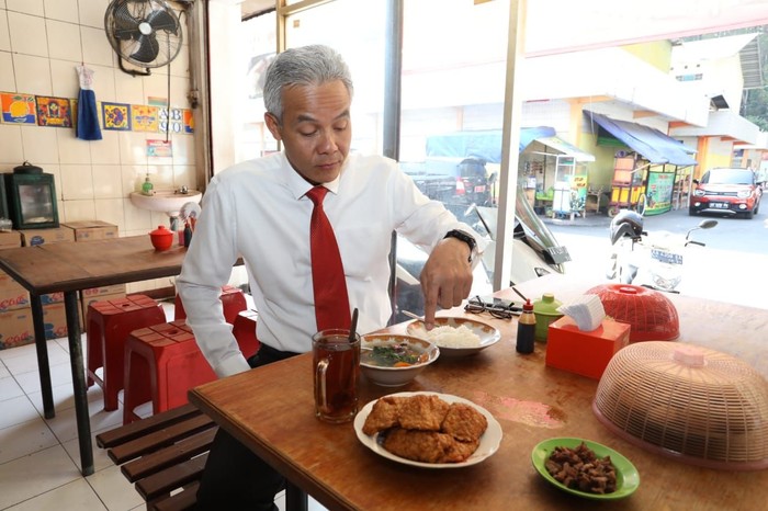 Ia pun langsung mencicipi menu andalan Sop Senerek tersebut. Sambil bertanya kepada pedagangnya, Ganjar menceritakan apa saja bahan yang ada dalam Sop Senerek itu.
