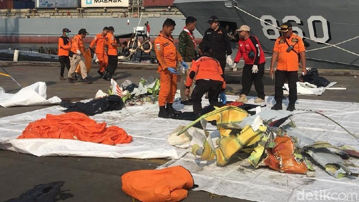 Pantauan detikcom, kedua kantong jenazah itu tiba di dermaga JICT 2, Tanjung Priok, Jakarta Utara, pukul 15.30 WIB, Jumat (2/11/2018). Kapal itu juga membawa serpihan kapal berbentuk seperti seng.