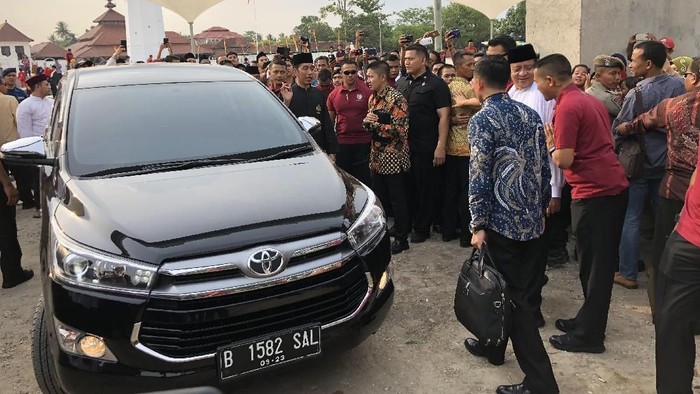 Sebelum masuk ke mobil Toyota Innova warna hitam, Jokowi tampak berganti pakaian dengan mengenakan baju ala pendekar silat berwarna hitam. Jokowi sempat bersalaman dan berfoto bersama warga. (jor/elz)
