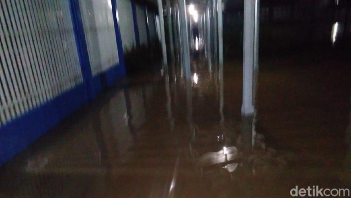 Hingga pukul 00.00 WIB, Kamis (15/11/2018), banjir masih menggenangi Lapas Jambi. Di dalam sel, banjir juga masih menggenangi sampai setinggi selutut orang dewasa. (rvk/dwia)