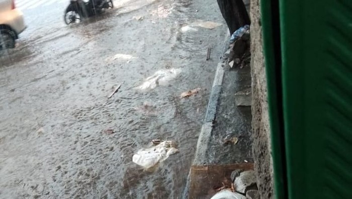 Dari beberapa foto yang diterima detikcom dari pemilik warung dekat Jalan Teuku Nyak Arif, Robi Ibrahim, Selasa (4/12/2018), pukul 16.40 WIB, terlihat beberapa karung berserakan pinggir jalan. Karung-karung itu hampir tertutup genangan sehingga tak terlihat oleh pengendara.