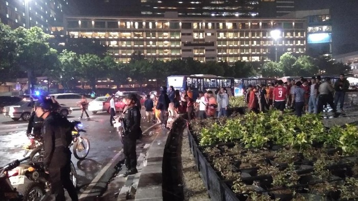 Massa Jakmania yang sempat memenuhi kawasan Bundaran HI mulai membubarkan diri. Mereka bubar secara tertib setelah diimbau polisi untuk pulang.