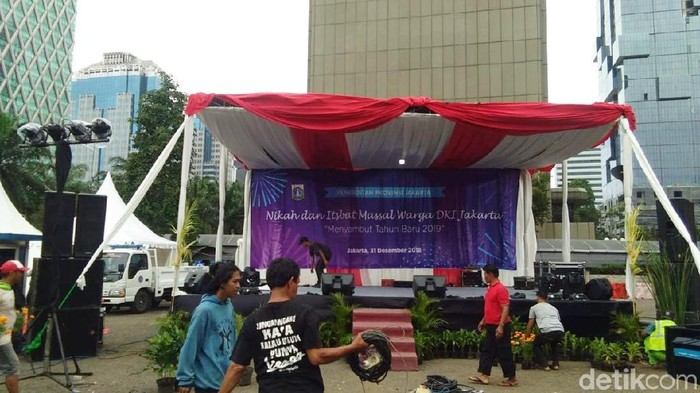 Lokasi nikah massal berada di lapangan parkir yang berlokasi di samping Gedung Bank Mandiri, Jalan MH Thamrin. Saat ini panitia telah menyiapkan panggung hingga perlengkapan lain yang akan dipakai nanti malam.